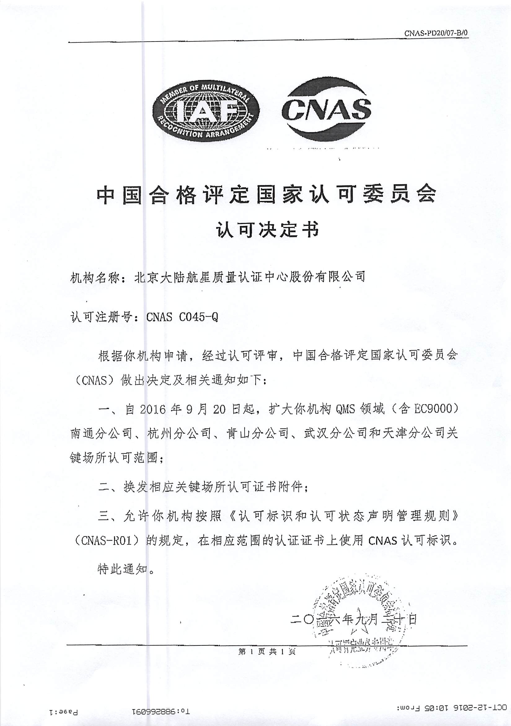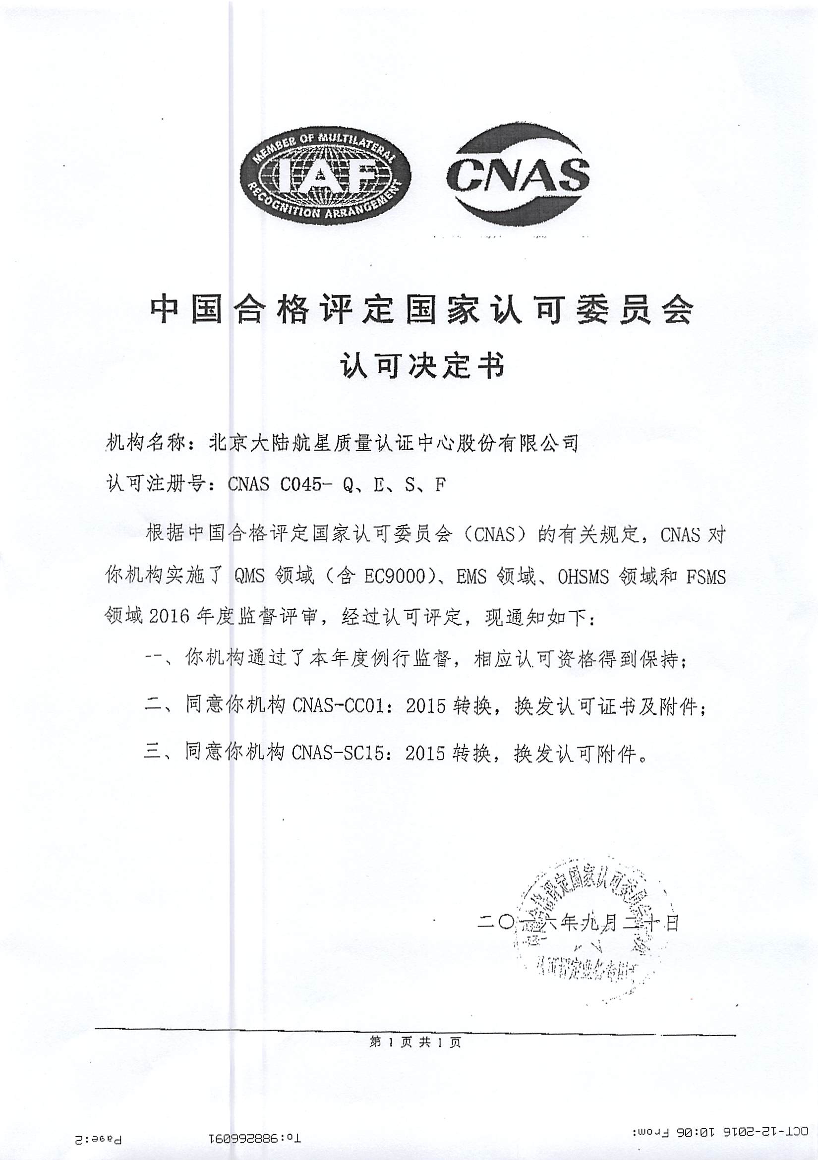 在管理層團隊的引領(lǐng)下,經(jīng)總部各部門、各分支機構(gòu)及相關(guān)人員的共同努力,北京大陸航星質(zhì)量認(rèn)證中心股份有限公司(以下簡稱HXQC),順利通過中國合格評定國家認(rèn)可委員會(CNAS),對我公司進行的例行監(jiān)督、轉(zhuǎn)換及擴大評審。保持了QMS(含EC9000)、EMS、OHSMSFSMS認(rèn)證領(lǐng)域的認(rèn)可資格,并通過了CNAS-CC01:2015CNAS-SC15:2015轉(zhuǎn)換評審,同時擴大了我公司QMS(含EC9000)認(rèn)證領(lǐng)域南通分公司、杭州分公司、青山分公司、武漢分公司和天津分公司5個關(guān)鍵場所。